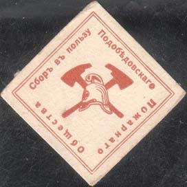 1915 1915 г. Ромб разм. 46 х 46 мм. Одноцветная печать на толстой белой бумаге. В двойной рамке в форме ромба разм. 40 х 40 мм в центре скрещенные пожарные топоры и каска пожарного. По внутреннему периметру рамке текст: «Сбор в пользу Подобедовского Пожарного общества».
