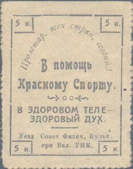 1925 1925 г. Разм. рамки 37 х 46 мм. Одноцветная печать на желтоватой бумаге. Нерегулярная зубц. В центре в прямоугольной рамке текст в две строки: «В помощь Красному Спорту». Сверху полукругом текст: «Пролетар[ии]. Всех стран, соединяйтесь!». Внизу текст в две строки: «В здоровом теле – здоровый дух». Внизу текст в две строки мелким шрифтом: «Уезд[ный]. Совет Физич[еской]. Культ[уре]. при Вал[уйском]. УИК». По углам рамки в прямоугольных рамках номинал.