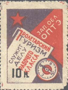 1930 1930(?) г. Разм. рамки 31 х 41 мм. Трехцветная печать на кремовой бумаге. Зубц. 10. В прямоугольной рамке в левом верхнем углу пятиконечная звезда. В правом нижнем углу компас. В левом нижнем углу номинал. Текст: «Зап[адное]. Обл[астное]. ОПТЭ. Пролетарский туризм служит делу рабочего класса».