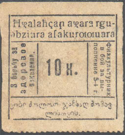 1931 1931 г. Разм. рамки 37 х 36 мм. Одноцветная печать на желтоватой бумаге. Зубц. 11 1/2. В центре в прямоугольной рамке номинал. Слева вертикально текст в три строки: «В борьбу за здоровое поколение». Справа вертикально текст в три строки: «Физкультурник в бой за выполнение 5-4 г.». Сверху текст в две строки на абхазском языке латинским шрифтом. Внизу текст в две строки на грузинском языке.