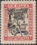 1930 1930 г. Разм. рамки 19 х 23,5 мм. Двухцветная печать на белой бумаге. Зубц. Лин. 11 1/2. С клеем. В двойной прямоугольной рамке в центре спортсмен бросает копье. На заднем плане дымящие трубы и трактор. Текст на украинском языке в три строки: «УССР. Киев. 1930». По периметру между рамками текст на украинском языке: «Первая всеукраинская крестьянская спартакиада». По углам между рамками серпы и молоты.
