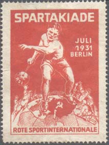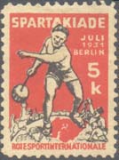 1931 1931 г. Рамки рис 18,5 х 20,5 мм. Двухцветная печать на кремовой бумаге. Зубц. 11 1/2. В центре эмблема КСИ. Сверху и справа текст на немецком языке: «Спартакиада июль 1931 Берлин». Справа номинал. Внизу текст на немецком языке: «Красный спортивный интернационал».