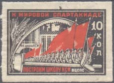 1932 1932 г. Разм. рамки 33 х 22 мм. Двухцветная печать на белой бумаге с В.З. «Ковер». С клеем. В центре в двойной прямоугольной рамке, образованной серпом и молотом колонна спортсменов с красными флагами. Слева вертикально номинал. Сверху текст: «К мировой спартакиаде». Внизу текст: «Построим школу КСИ ВЦСПС».
