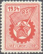 1934 1934 г. Разм рамки 20 х 27 мм. Одноцветная печать на белой бумаге. Зубц. 11 1/2. с клеем. В центре в двойной прямоугольной рамке с закругленными углами значок красного спортивного интернационала. В левом верхнем углу дата: «1934». Внизу аббревиатура «КСИ» на русском, французском и немецком языках.