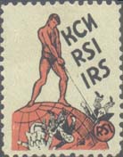 1934 1934(?) г. Рамки по перфорации 23 х 29 мм. Двухцветная печать на кремовой бумаге. Зубц. 11. С клеем. В центре эмблема КСИ: спортсмен с молотом на фоне земного шара. Справа по диагонали аббревиатура «КСИ» на русском, французском и английском языках.