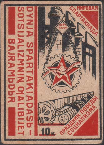 1932 1932 г. Разм. рамки 53 х 74 мм. Двухцветная печать на желтоватой бумаге. В толстой прямоугольной рамке слева значок БГТО на фоне заводских построек. Текст в четыре строки: «Мировая спартакиада праздник победы социализма». Внизу номинал. Слева вертикально сверху вниз текст в три строки на татарском языке латинским шрифтом.