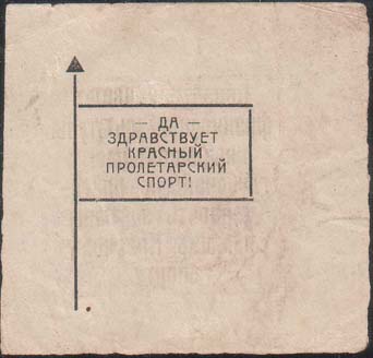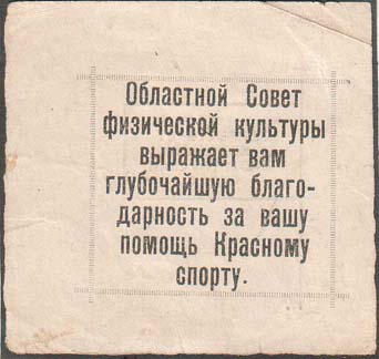 1930 1930(?) г. Разм. рамки 56 х 54 мм. Одноцветная двухсторонняя печать на белой бумаге. На лицевой стороне в прямоугольной рамке разм. 37,5 х 33 мм текст семь строк: «Областной Совет физической культуры выражает вам глубочайшую благодарность за вашу помощь Красному спорту». На оборотной стороне стилизованное изображение флажка с текстом в четыре строки: «Да здравствует красный пролетарский спорт!».