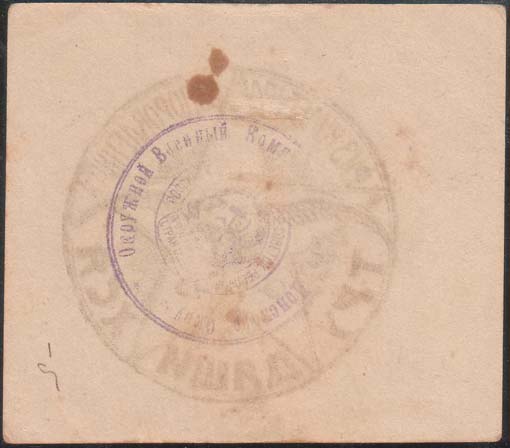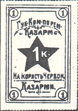 1925 1925 г. Разм. рамки 38 х 57 мм. Одноцветная печать на белой бумаге. Зубц. 11 1/2. В тройной прямо-угольной рамке в центре пятиконечная звезда с номиналом. Сверху текст в две строки: «Губ[ернский]. Ком[итет]. по рем[онту]. Казарм». Внизу текст в две строки на украинском языке: «В пользу Красн[ой]. Казармы». По углам в круглых рамках номинал.