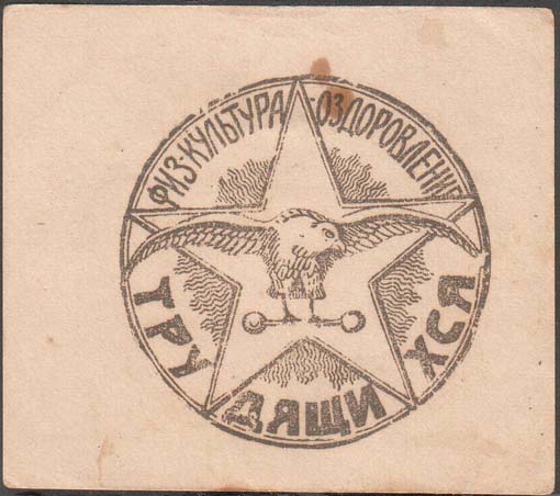 1924 1924(?) г. . Разм. 85 х 74 мм. Одноцветная печать на кремовой бумаге. На лицевой стороне в двойной круглой рамке диаметром 57 мм значок – орел, держащий в лапах штангу на фоне пятиконечной звезды. По внутреннему периметру рамки текст: «Физкультура – оздоровление трудящихся». На оборотной стороне фиолетовый оттиск круглой печати диаметром 39 мм. В центре герб РСФСР. По внутреннему периметру рамки неразборчивый текст.