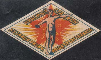 1928 1928(?) г. Ромб разм. 59 х 35 мм. Трехцветная печать на белой бумаге. В рамке в форме ромба разм. 55 х 32 мм в центре на фоне звезды обнаженный спортсмен-метатель диска. Текст: «Красный стадион кузница физич[еской].мощи пролетариата».