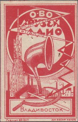 1928 1928(?) г. Разм. рамки 43 х 67 мм. Одноцветная печать на белой бумаге. В центре в прямоугольной рамке завод, радиомачта и репродуктор и зигзагообразная стрела. Сверху на фоне громкоговорителя текст в три строки: «Общество Друзей Радио». Внизу в прямоугольной рамке скрещенные серп и молот и текст: «Владивосток». Внизу под рамкой выходные данные мелким шрифтом: «Гублит. №1017» Лит. Иосиф Корот.