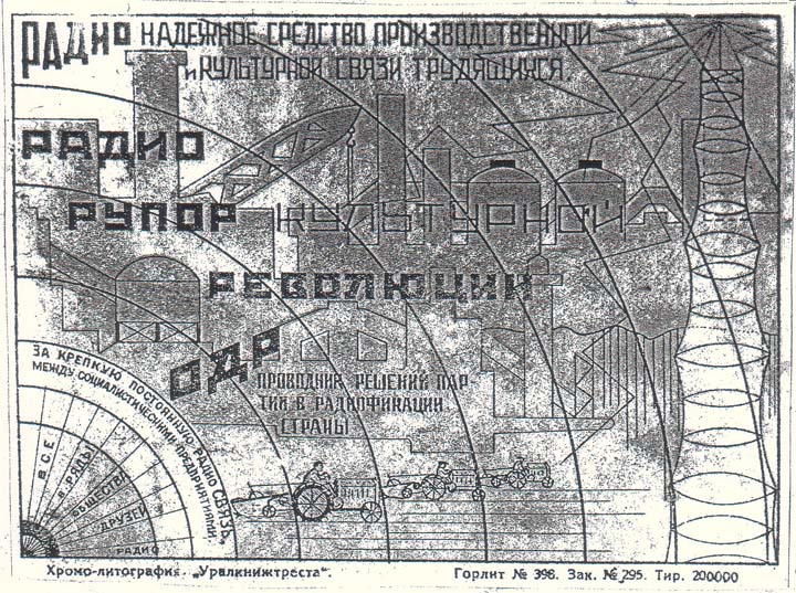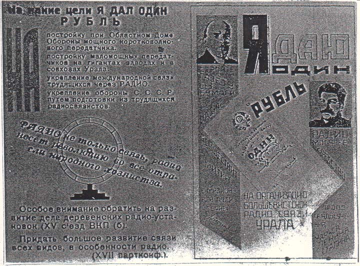 1931 1931 г. Листок разм. 134 х 98 мм. Многоцветная двухсторонняя печать на сероватой бумаге. На лицевой стороне справа в прямоугольной рамке разм. 58 х 88 мм в центре банкнота в 1 рубль и текст в семь строк: «Я даю один рубль на организацию большевистской радио связи Урала». Слева портрет В.И.Ленина и текст в десять строк: «Стройте газету без бумаги. Радио осуществит митинг с миллионной аудиторией. Ленин». Справа портрет И.В.Сталина и текст в девять строк: «Радио – могучее средство пропаганды учения Маркса, Ленина, Сталина». Слева сверху текст в тринадцать строк: «На какие цели я дал один Рубль. На постройку при Областном Доме Обороны мощного коротковолнового передатчика. На постройку маломощных передатчиков на гигантах заводах и в колхозах Урала. На укрепление международной связи трудящихся через радио. На укрепление обороны С.С.С.Р. путем подготовки из трудящихся радиосвязистов». Слева в центре стилизованное изображение громкоговорителя и текст в три строки по диагонали: «Радио не только связь, радио несет революцию во все отрасли народного хозяйства». Слева внизу текст в шесть строк: «Особое внимание обратить на развитие деревенских радио-установок (XV съезд ВКП(б)). Придать большое развитие связи всех видов, в особенности радио. (XVII партконф[еренция].)». На оборотной стороне в прямоугольной рамке разм. 124 х 88 мм аграрно-индустриальный пейзаж. Слева радиовышка. Слева снизу схематическое изображение расходящихся радиоволн. Сверху текст в две строки: «Радио – надежное средство производственной и культурной связи трудящихся». В центре текст в семь строк: «Радио - рупор революции. ОДР – проводник решений партии в радиофикации страны». В левом нижнем углу текст семь строк: «За крепкую постоянную радио Связь между социалистическими предприятиями. Все в ряды Общества Друзей Радио». Внизу под рамкой выходные данные мелким шрифтом: «Хромолитография «Уралкнижтреста». Горлит №398. Зак. №295. Тир. 200000».