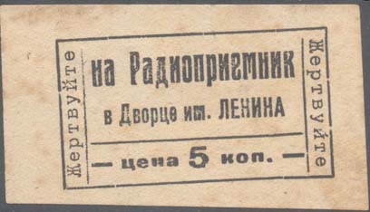 1932 1932 г. Разм. 67 х 37 мм. Одноцветная печать на желтоватой бумаге. В центре в прямоугольной рамке разм. 50 х 28 мм сверху текст в две строки: «На радиоприемник во дворце им. Ленина». Внизу под горизонтальной чертой номинал: «Цена 5 коп.». Слева и справа вертикально тексты: «Жертвуйте».