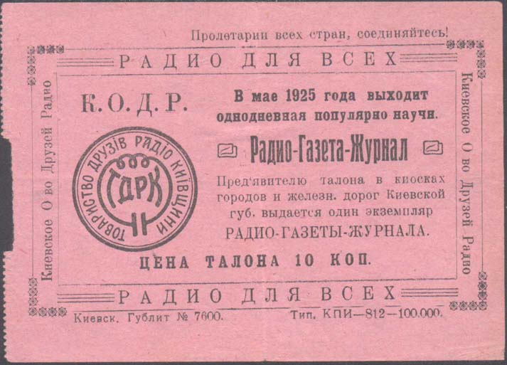 1925 1925 г. Листок из квитанционной книжки разм. 119 х 85 мм. Одноцветная печать на тонкой розовой бума-ге. Левосторонняя Зубц. 11 1/2. В двойной прямоугольной рамке с декоративными элементами по углам справа текст в семь строк: «В мае 1925 года выходит однодневная популярно научн[ая]. Радио-Газета-Журнал. Предъявителю сего талона в киосках городов и железн[ых]. дорог Киевской губ[ернии]. Выдается один экземпляр Радио-Газеты-Журнала». Слева сверху аббревиатура «К.О.Д.Р.» Ниже эмблема общества. Внизу текст: «Цена талона 10 коп.». По периметру между рамками текст, повторенный дважды: «Киевское О-во Друзей Радио. Радио для всех». Сверху текст: «Пролетарии всех стран, соединяйтесь!». Внизу под рамкой выходные данные мелким шрифтом: «Киевск. Гублит №7600. Тип. КПИ-812-100.000».