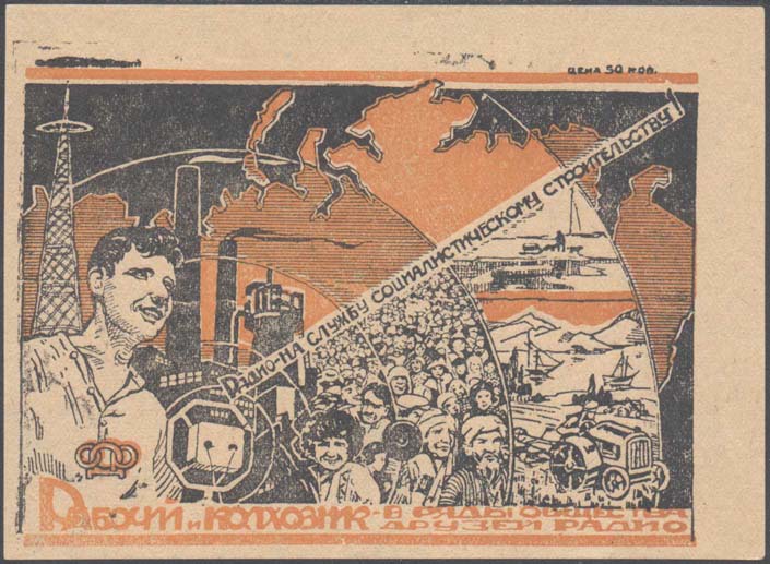 1932 1932 г. Листок разм. 118 х 85 мм. Двухцветная печать на желтоватой бумаге. В прямоугольной рамке разм. 104 х 73 мм слева человек перед микрофоном на фоне радиомачты и завода. Справа на фоне контурного изображения карты СССР и схематически изображенных радиоволн скопление людей разных национальностей, трактор, работающий в поле, корабли и упряжка с нартами. По диагонали текст: «Радио – на службу социалистическому строительству!». Внизу текст в три строки: «ОДР. Рабочий и колхозник – в ряды общества Друзей Радио». Сверху справа номинал: «Цена 50 коп.».