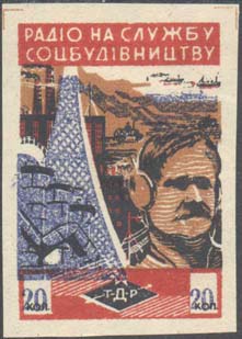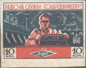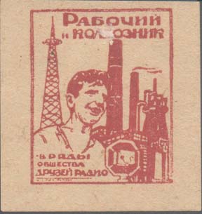1932 1932(?) г. Разм. 48 х 51 мм. Одноцветная печать на желто-ватой бумаге. В прямоугольной рамке разм. 34 х 42 мм человек перед микрофоном на фоне радиомачты и завода. Сверху текст в две строки: «Рабочий и колхозник». В правом нижнем углу продолжение текста в три строки: «В ряды общества Друзей Радио».