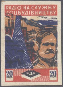 1932 1932 г. Трехцветная и многоцветная печать на белой бумаге. В прямоугольной рамке различные сюжеты. Сверху текст на украинском языке: «Радио на службу социалистического строительства». Внизу эмблема общества. В нижних углах номинал.
