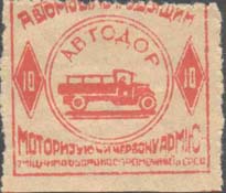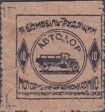 1932 1932 г. Разм. рамки 29 х 28 мм. Одноцветная печать на розово-серой бумаге. Нерегулярная зубц. В центре в двойной круглой рамке диаметром 19 мм грузовой автомобиль и аббревиатура «АВТОДОР». Слева и справа в ромбовидных рамках номинал. Сверху полукругом текст на украинском языке: «Автомобиль - трудящимся». Внизу текст в две строки на украинском языке: «Моторизуя Красную Армию – укрепляешь обороноспособность СССР».