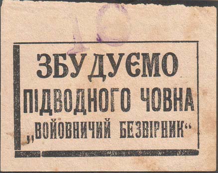 1930 1930(?) г. Разм. рамки 64 х 39 мм. Одноцветная печать желтоватой бумаге. В прямоугольной рамке текст на украинском языке в три строки: «Построим подводную лодку «Воинствующий Безбожник»». На лицевой стороне крупная фиолетовая надпечатка номинала в виде цифры «10».