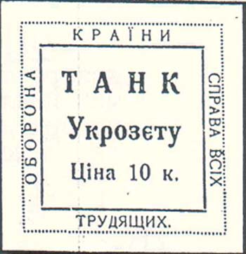 1932 1932(?) г. Одноцветная печать желтоватой бумаге. В двойной прямоугольной рамке в центре текст на украинском языке в две строки: «Танк УКРОЗЕТа». Ниже номинал: «Цена 10 к.». По периметру между рамками текст: «Оборона страны – дело всех трудящихся».