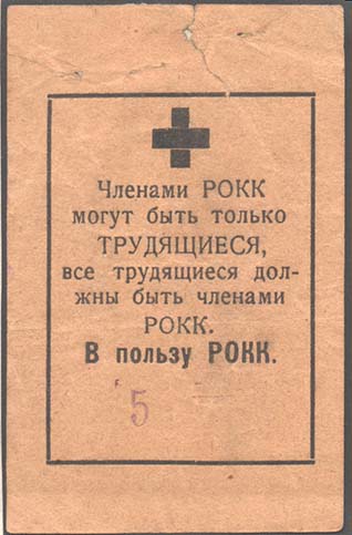 1928 1928 г. 01.12.1928 г. Разм. 51 х 80 мм. Одноцветная печать на серо-желтой бумаге. В прямоугольной рамке разм. 40 х 55,5 мм сверху красный крест. Ниже текст в семь строк: «Членами РОКК могут быть только трудящиеся, все трудящиеся должны быть членами РОКК. В пользу РОКК». Внизу надпечатка нумератором цифры «5» светло-синего цвета.