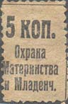 1925 1925(?) г. Разм. по перфорации 16 х 24 мм. Одноцветная печать на желто-серой бумаге. Зубц. 11 1/2. Сверху номинал. Ниже текст в три строки: «Охрана Материнства и Младенч[ества].».
