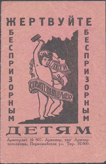 1924 1924 г. Разм. 60 х 92 мм. Одноцветная печать на бумаге различных цветов. В центре ребенок с зубилом и молотком. На ленте текст: «Дети – строители будущего». По периметру текст: «Жертвуйте беспризорным детям». Внизу мелким шрифтом выходные данные: «Армокрлит №807. Армавир, тип. Армокрисполкома, Первомайская ул. Тир. 10 000».