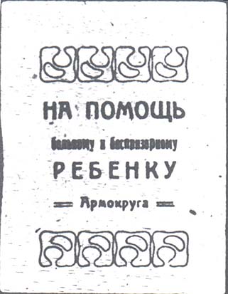1924 1924 г. Разм. 55 х 71 мм. Одноцветная печать на светло-розовой бумаге. В центре текст в четыре строки: «На помощь больному и беспризорному ребенку Армокруга». Сверху и снизу декоративные элементы.