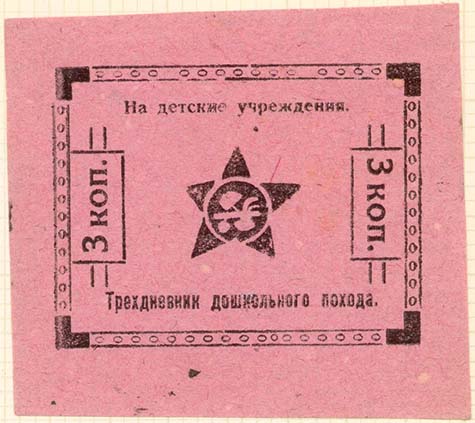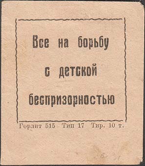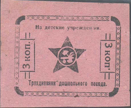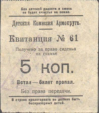 1924 1924(?) г. Листок из квитанционной книжки разм. 65 х 75 мм. Одноцветная печать на тонкой серой бумаге. Сверху зубц. 11 1/2. В центре текст в шесть строк: «Детская комиссия Армокруга. Квитанция №... Получено за право сидения на скамье 5 коп. Встал - билет пропал. Без права передачи». Сверху текст в две строки: «Без детской радости и смеха не будет счастья на земле». Внизу под чертой текст в две строки: «В стране пролетариата не должно быть беспризорных детей». На лицевой стороне фиолетовый оттиск треугольной печати с неразборчивым текстом.
