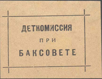 1924 1924(?) г. Разм. рамки 72 х 56 мм. Одноцветная печать на желто-серой бумаге. В прямоугольной рамке разм. 55 х 37 мм тест в три строки: «Деткомиссия при Баксовете».
