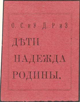 1919 1919 г. 15.09.1919 г. Разм. 46 х 59 мм. Одноцветная печать на бумаге различных цветв. В центре в двойной прямоугольной рамке прямоугольной рамке разм. 37,5 х 45 мм сверху аббревиатура «О.С.и У.Д.Р.и З.». В центре текст в три строки: «Дети надежда Родины».
