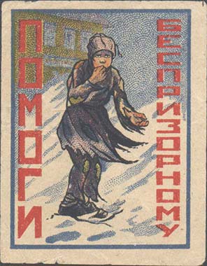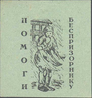 1924 1924(?) г. Разм. 60 х 66 мм. Одноцветная печать на светло-зеленой бумаге. В центре беспризорник на фоне здания. Вертикально текст: «Помогите беспризорному».