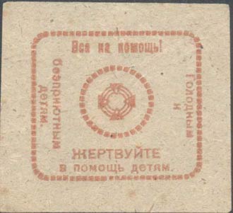 1922 1922 г. Разм. 52 х 55 мм. Одноцветная печать на бумаге различных цветов и качества. В рамке из квадратиков с закругленными краями разм. 35 х 40 мм. В центре круг из квадратиков с орнаментом в центре. По периметру рамки текст: «Все на помощь! Голодным и беспризорным детям. Жертвуйте в помощь детям».