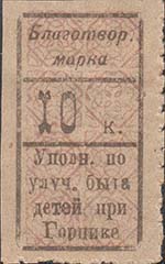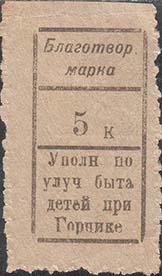 1924 1924(?) г. Разм. 27 х 48 мм. Одноцветная печать на желтоватой бумаге. Нерегулярная зубцовка. В прямоугольной рамке разм. 19 х 36 мм в центре номинал. Сверху текст в две строки: «Благотвор[ительная]» марка. Внизу текст в четыре строки: «Уполн[омоченный] по улуч[шению] быта детей при Горцике».