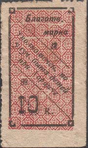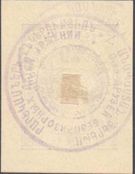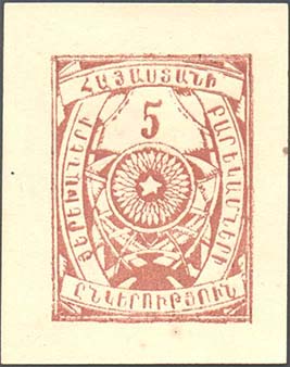 1925 1925(?) г. Разм. 44 х 56 мм. Одноцветная печать на плотной кремовой бумаге. В центре в двойной прямоугольной рамке разм. 31 х 41 в декоративной рамке в центре в круге пятиконечная звезда. На лентах по периметру рамке текст на армянском языке: «Общество друзей беспризорных детей Армении». Сверху на картуше номинал. На обороте фиолетовый оттиск круглой печати общества.