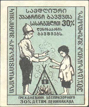 1924 1924(?) г. Разм. 51 Х 62 ММ. Двухцветная печать на белой бумаге. В двойной прямоугольной рамке разм. 44 х 57 мм двое беспризорных детей у костра, на котором подвешен котелок. Внизу текст в две строки: «Трехдневник беспризорного. 30% детям Ленинакана». Сверху текст в пять строк на армянском языке. Слева и справа между рамками тексты на армянском языке.