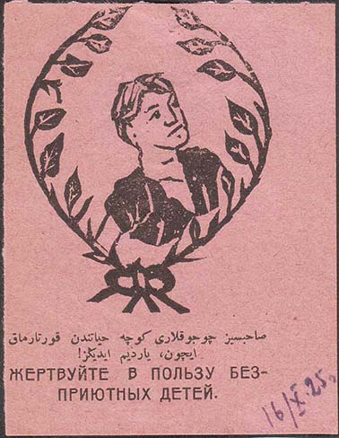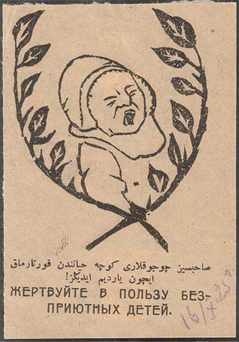 1925 1925 г. 16.10.1925 г. Одноцветная печать на бумаге различных цветов. В центре различные рисунки. Внизу текст в две строки на русском и азербайджанском языке арабской графикой: «Жертвуйте в пользу бесприютных детей».