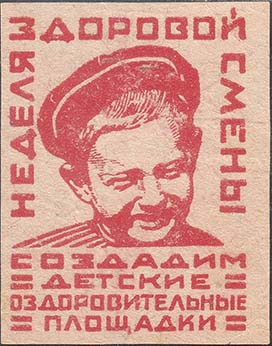 1926 1926(?) г. Разм. 46 х 61 мм. Одноцветная печать на желто-ватой бумаге. В центре изображение головы ребенка в кепке. Сверху и по бокам по периметру текст: «Неделя здоровой смены». Внизу текст в четыре строки: «Создадим детские оздоровительные площадки» и декоративные элементы в виде четырех пар коротких горизонтальных линий.