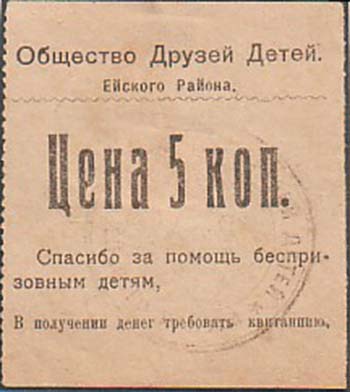 1926 1926(?) г. Листок из квитанционной книжки разм. 54 х 60 мм. Одноцветная печать на желтоватой бумаге. Левосторонняя нерегулярная зубц. В центре номинал: «Цена 5 коп.». Сверху текст в две строки: «Общество Друзей Детей Ейского Района» и горизонтальная волнистая черта. Внизу текст в три строки: «Спасибо за помощь беспризорным детям. В получении денег требовать квитанцию». На лицевой стороне черный оттиск круглой печати с неразборчивым текстом.