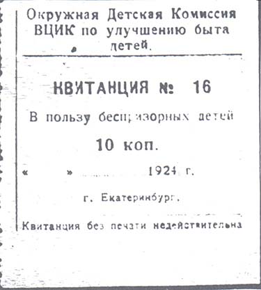 1924 1924 г. Листок из квитанционной книжки разм. 64 х 70 мм. одноцветная печать на кремовой бумаге. Левосторонняя нерегулярная зубцовка. В центре текст в пять строк: «Квитанция №... В пользу беспризорных детей. 10 коп. «...»...1924 г. г. Екатеринбург. Квитанция без печати недействительна». Сверху текст в три строки: «Окружная Детская Комиссия ВЦИК по улучшению быта детей». Ниже горизонтальная черта. Слева вертикальная черта.