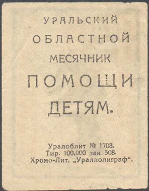 1925 1925 г. Многоцветная двухсторонняя печать на сероватой бумаге. На лицевой стороне в рамке разм. 43 х 53 мм беспризорник на фоне дома. По краям сверху вниз текст: «Помоги беспризорному». На оборотной стороне текст в пять строк: «Уральский областной месячник помощи детям». Ниже мелким шрифтом выходные данные в три строки: «Уралоблит N 1708. Тир. 100.000 зак. 508. Хромо-Лит. «Уралполиграф»».