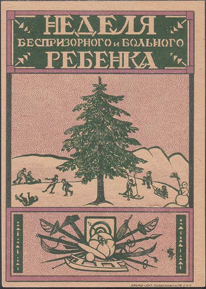 1925 1925(?) г. Разм. 68 х 96 мм. Двухцветная печать на желтоватой бумаге. В центре в прямоугольной рамке разм. 63 х 90 мм елка, горки и играющие дети. Сверху текст в три строки: «Неделя беспризорного и больного ребенка». Внизу разнообразный спортивный инвентарь. Справа внизу выходные данные мелким шрифтом: «Хромо-лит. Полиграфкуста. Е-К-Б».