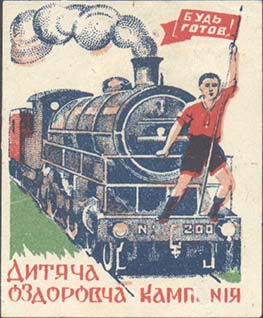 1930 1930 г. Разм. 44 х 53 мм. Республиканский выпуск. Многоцветная печать на белой бумаге. Паровоз, на котором стоит пионер с флажком. На флажке текст: «Будь готов!». Внизу текст в две строки на украинском языке: «Детская оздоровительная компания».