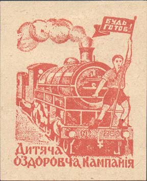 1930 1930 г. Разм. 48 х 60 мм. Одноцветная печать на желто-ватой бумаге. Паровоз, на котором стоит пионер с флажком. На флажке текст: «Будь готов!». Внизу текст в две строки на украинском языке: «Детская оздоровительная компания».
