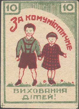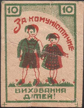 1931 1931 г. Разм. рамки 42,5 х 58 мм. Двухцветная печать на тонкой сероватой бумаге. В центре двое де-тей держатся за руки. Сверху текст на украинском языке: «За коммунистическое». Внизу продолжение текста в две строки: «Воспитание детей!». Сверху в углах рамки номинал.