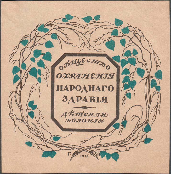 1916 1916 г. 28.-30.09.1916 г. Разм. 47 х 47 мм. Двухцветная печать на бумаге различных оттенков и качества. В центре в обрамлении венка из березовых листьев восьмиугольная рамка разм. 19 х 20,5 мм. Сверху в рамке текст в четыре строки: «Общество охранения народного здравия». Внизу текст в две строки: «Детская колония». Внизу в основании венка дата: «1916» и буквы «Г» и «Н». В правом нижнем углу выходные данные мелким шрифтом: «Лит. «Виктория», Знаменская, 17».