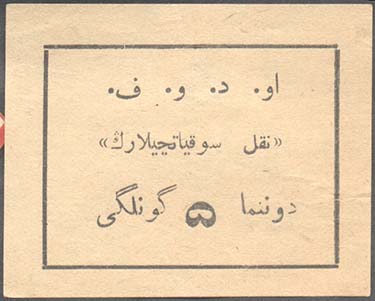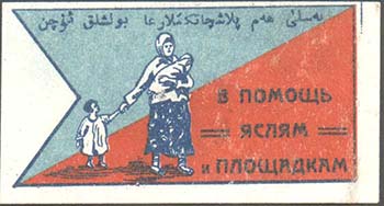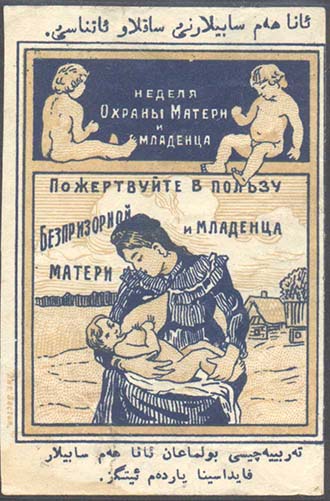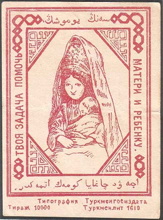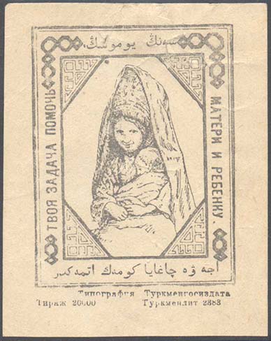 1925 1925(?) г. Разм. 63 х 77 мм. Одноцветная печать на бумаге различных цветов и качества. В двойной пря-моугольной рамке разм. 48,5 х 62,5 мм в центре отдельной восьмиугольной рамке женщина в национальном костюме с ребенком на руках. По периметру между рамками текст на русском и местном языке арабским шрифтом: «Твоя задача помочь матери и ребенку».
