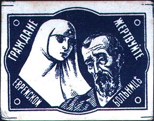 1915 1915(?) г. Разм. рис. 51 х 37,5 мм. Одноцветная печать на белой бумаге. Сестра милосердия и больной. Текст: «Граждане, жертвуйте еврейской больнице».
