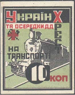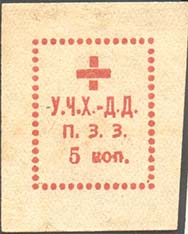 1925 1925(?) г. Разм. 31 х 38 мм. Одноцветная печать на желтоватой бумаге. В прямоугольной рамке из кружков разм. 20 х 25 мм сверху красный крест. Ниже аббревиатура на украинском языке: «У.К.К. - Д.Д. Ю.З.Ж.Д.». Ниже номинал.