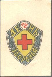 1961 1961 г. Разм. 30 х 44 мм. Трехцветная печать на плотной белой бумаге. В центре в рамке в виде щитка сложной формы разм. 22 х 26 мм красный крест. По периметру между рамками растительный орнамент и текст: «1961 год. День здоровья».
